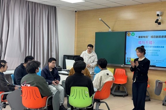 交流互动阶段,同学们踊跃发言,分享自己对未来伴侣的期待,言语间饱含对美好爱情的向往。活动尾声,大家围成一圈,围绕婚恋相关话题各抒己见,积极分享自身独特见解,现场形成良好的交流氛围。