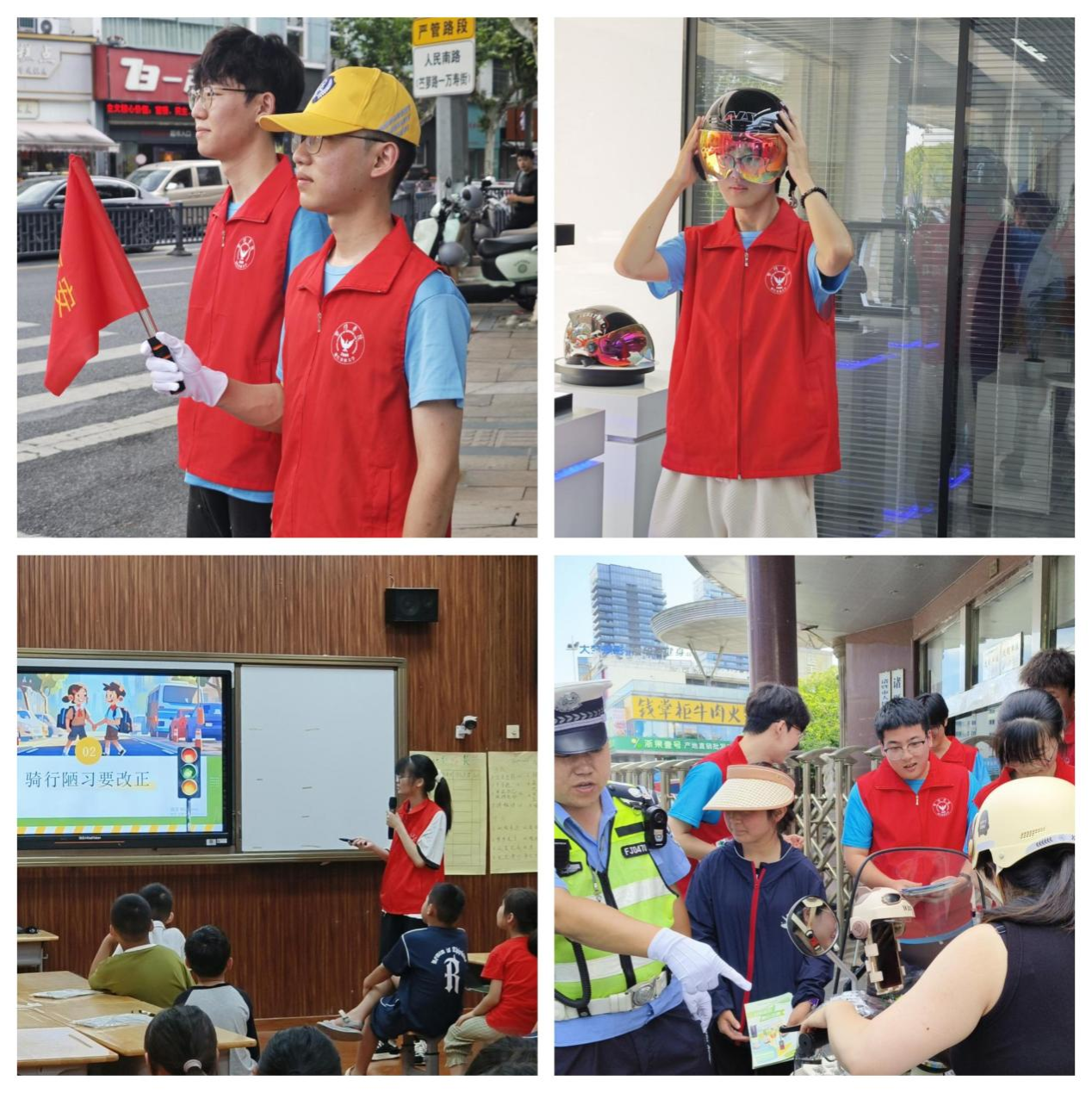 2025年6月24日起,团队在诸暨市开展多场景实践活动。启动阶段召开动员大会,并在当地交警大队铁骑中队带领下熟悉工作环境;技能培训阶段组织学习急救知识与交通法规,参与城区路口晚高峰疏导,劝导不文明行为;下乡服务阶段赴五泄镇江滨村开展环境整治,联合交警进行安全宣讲;基层研学阶段走访枫桥中队与“红枫义警”联合会,学习“枫桥经验”与智慧交管成果。团队还进入校园开展趣味宣教,协助筹备建党主题活动,在商圈宣传文明出行,全面参与平安建设。