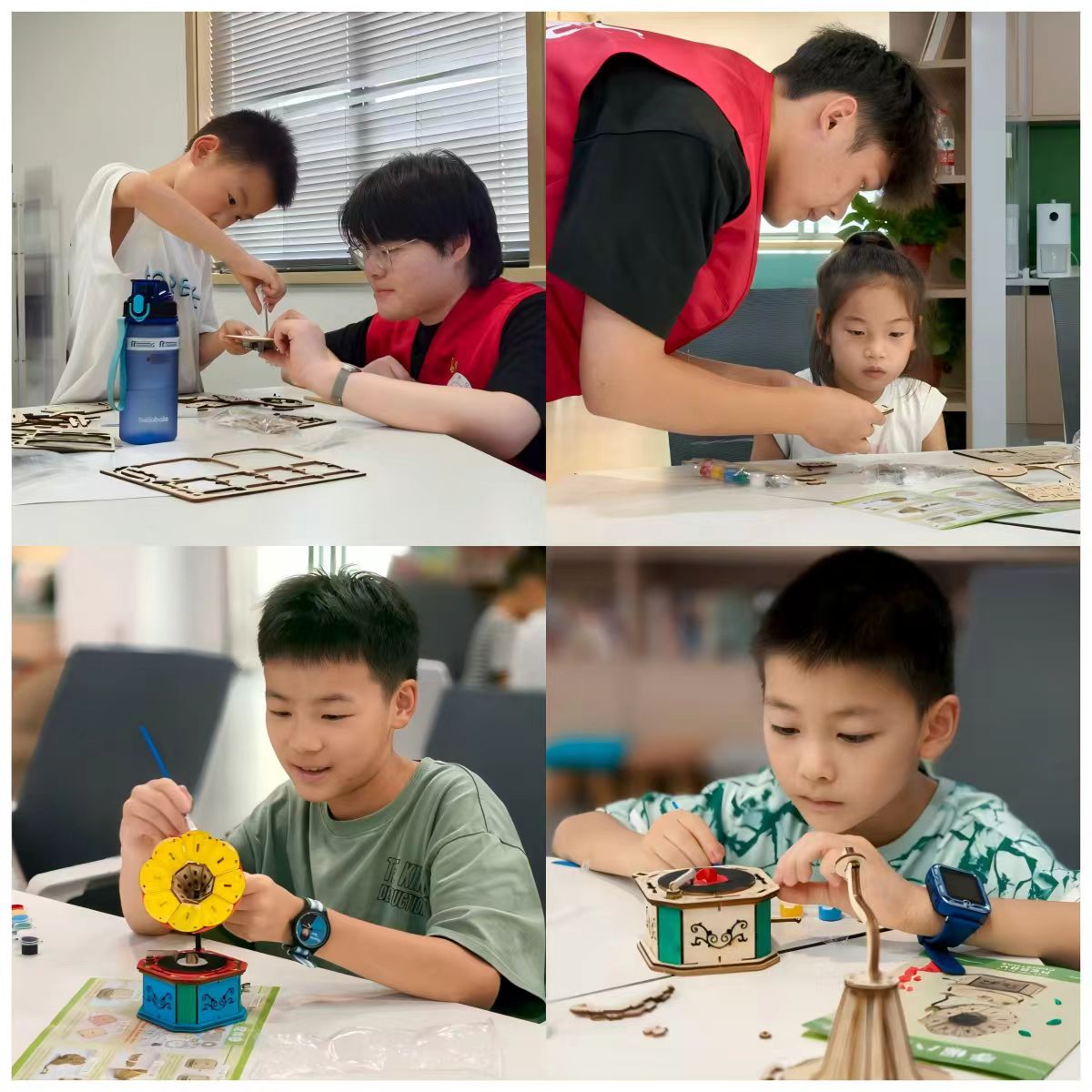 志愿者耐心解答孩子们在拼装过程中遇到的问题,帮助他们克服困难。同时,引导孩子们思考音乐盒如何改变音乐节奏,鼓励他们提出自己的想法和疑问,培养创新思维和解决问题的能力。