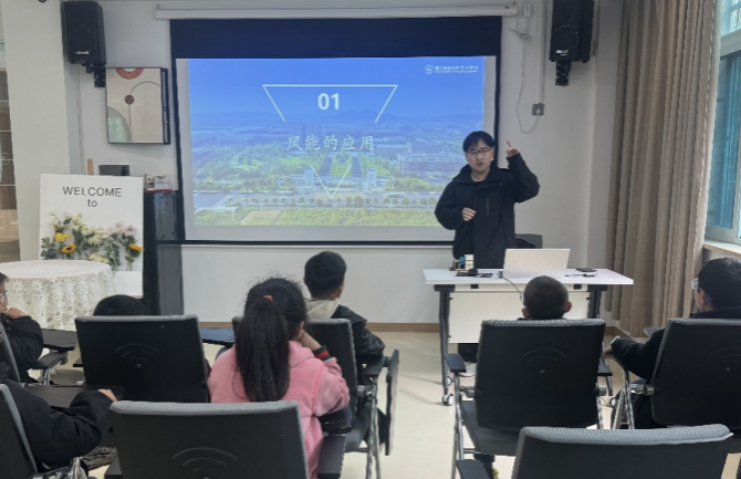 课堂上,学生党员立足专业,用通俗的语言为小朋友讲解古老风车与现代风力发电场的演变历史,并细致讲解风力发电原理。