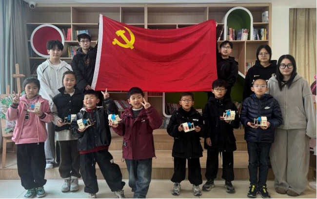 学生党员们与小朋友携手搭建塔吊模型,在动手实践中激发孩子们对科技的向往,践行“科技报国”的活动初心。