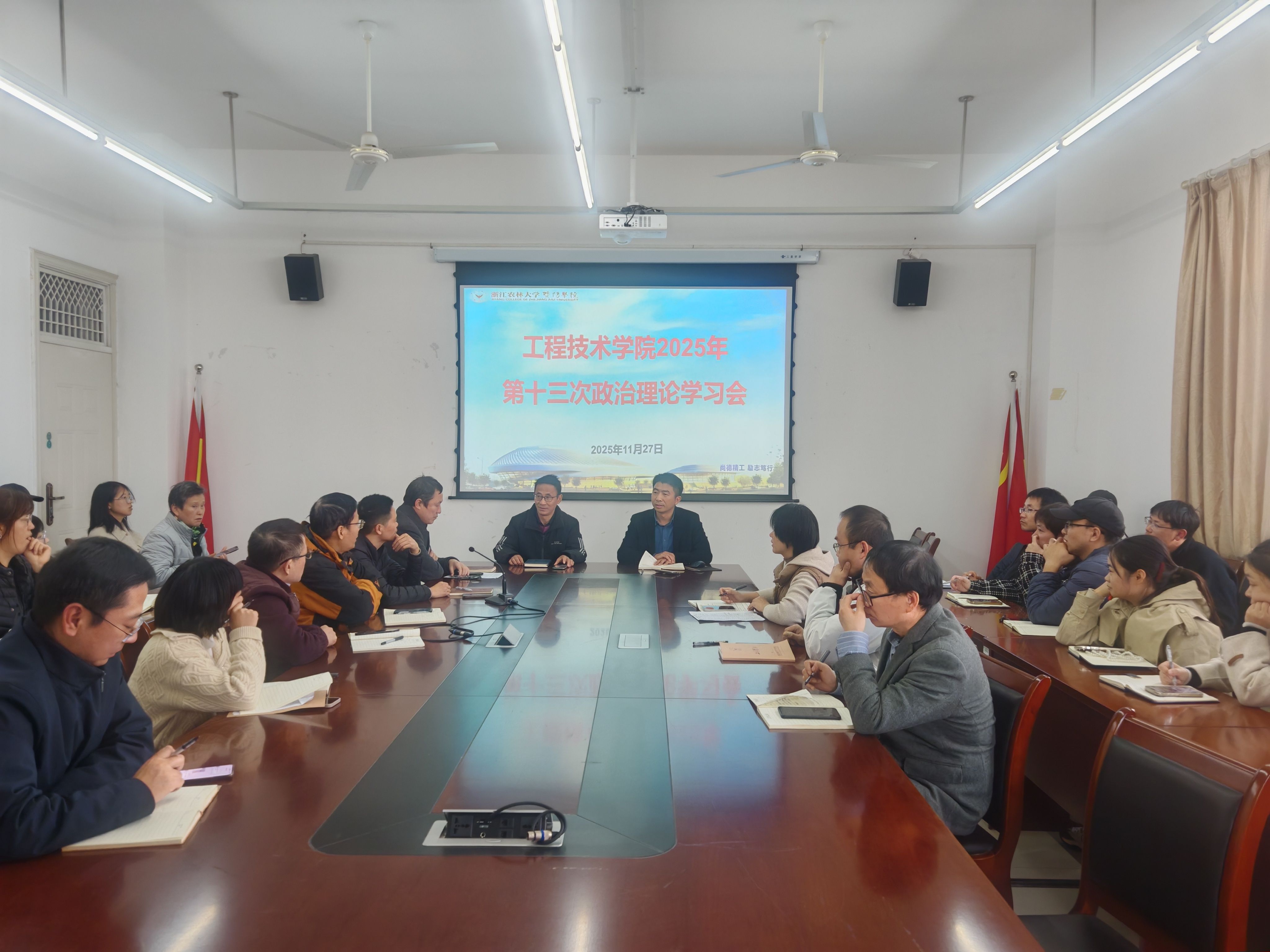 11月27日下午,工程技术学院在理工3402会议室召开2025年第十三次政治理论学习会。会议由副院长胡建华主持,院长彭樟林、党总支书记林爱广、副院长孙怀君出席会议,全体教职工参加会议。
