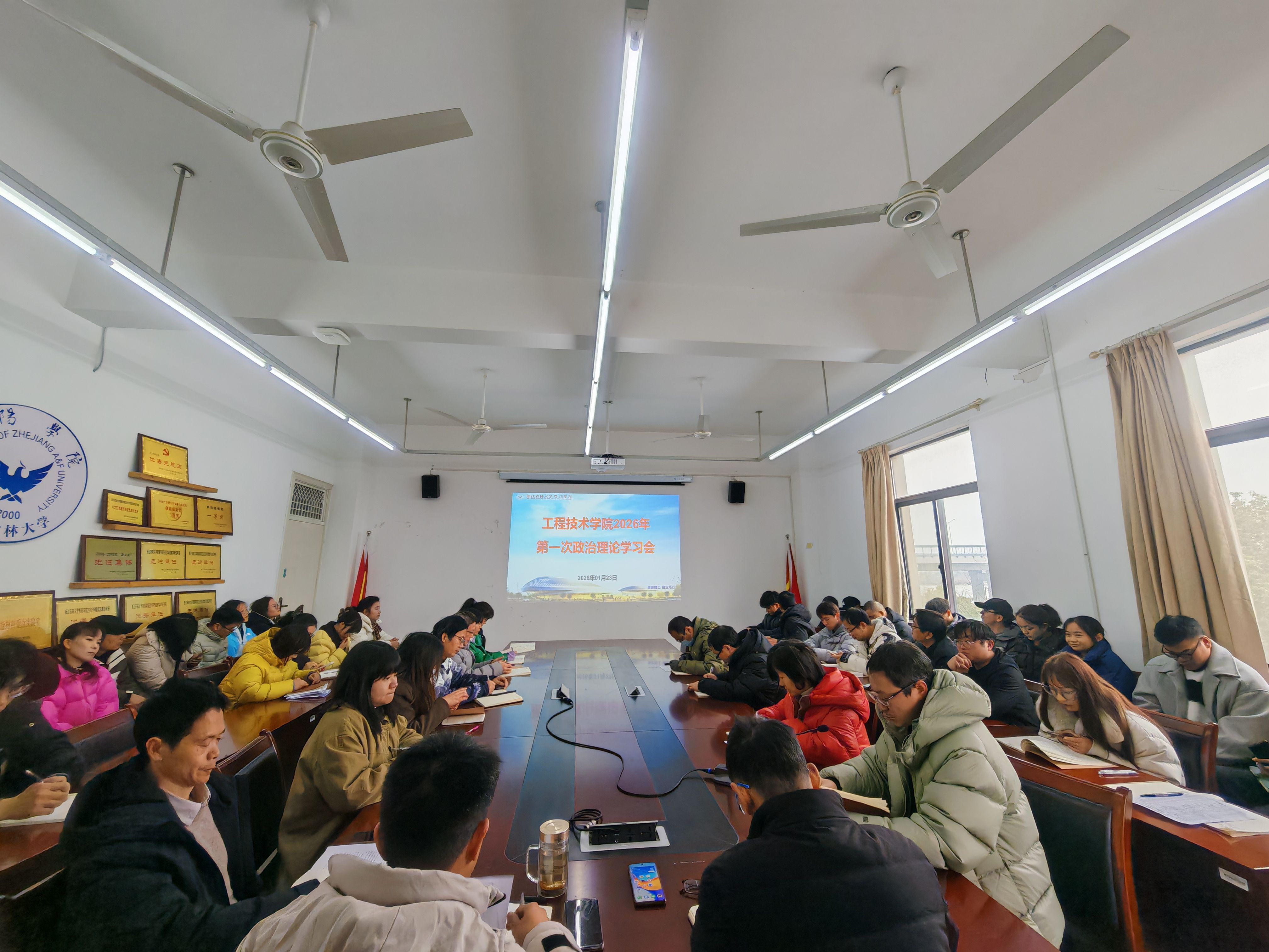 1月23日下午,工程技术学院在理工3402会议室召开2026年第一次政治理论学习会。院长彭樟林、党总支书记林爱广、副书记戚愉彩、副院长孙怀君出席会议,全体教职工参加会议。会议由副院长胡建华主持。