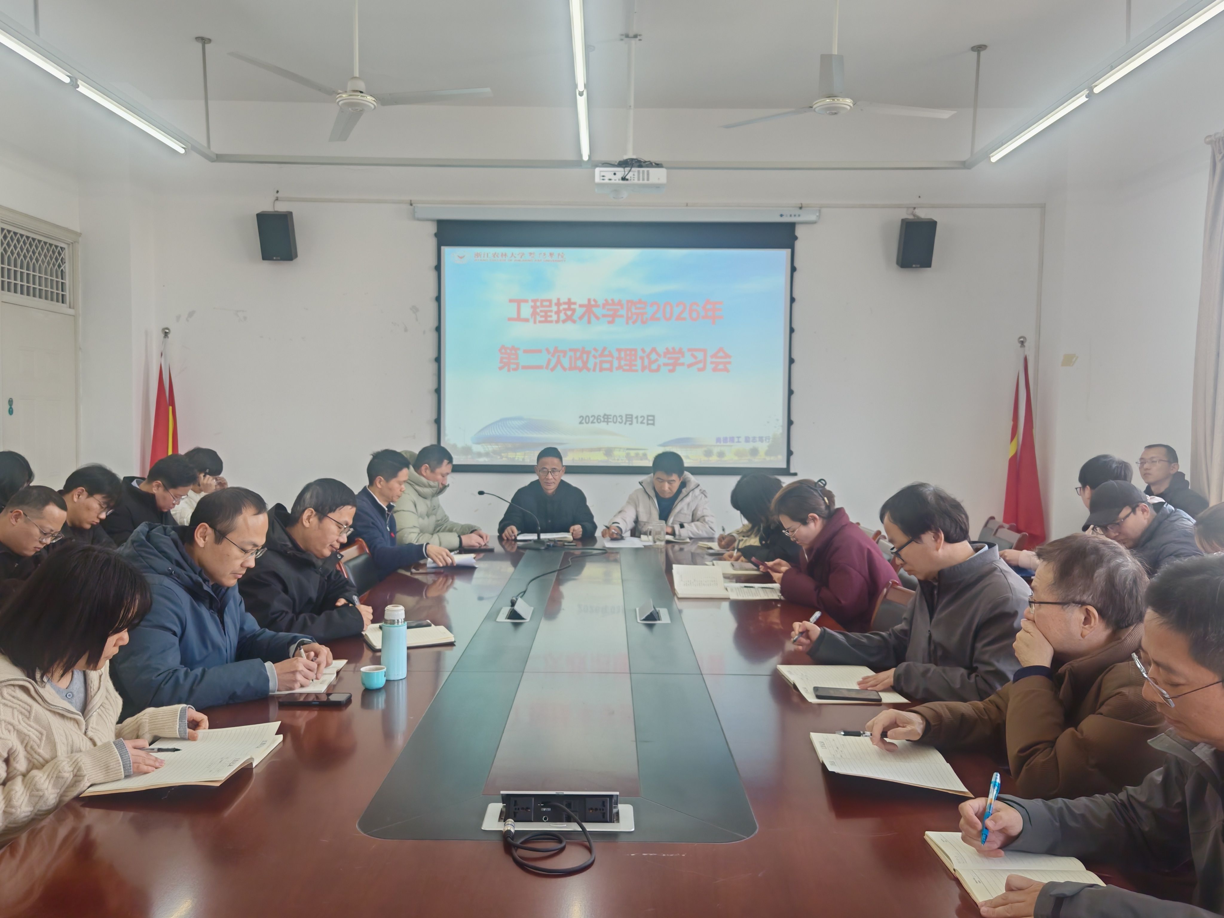 3月12日下午,工程技术学院在理工3402会议室召开2026年第二次政治理论学习会。院长彭樟林、党总支书记林爱广、副书记戚愉彩、副院长孙怀君出席会议,全体教职工参加会议。会议由副院长胡建华主持。
